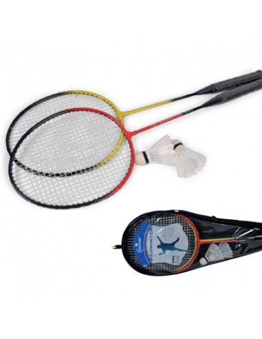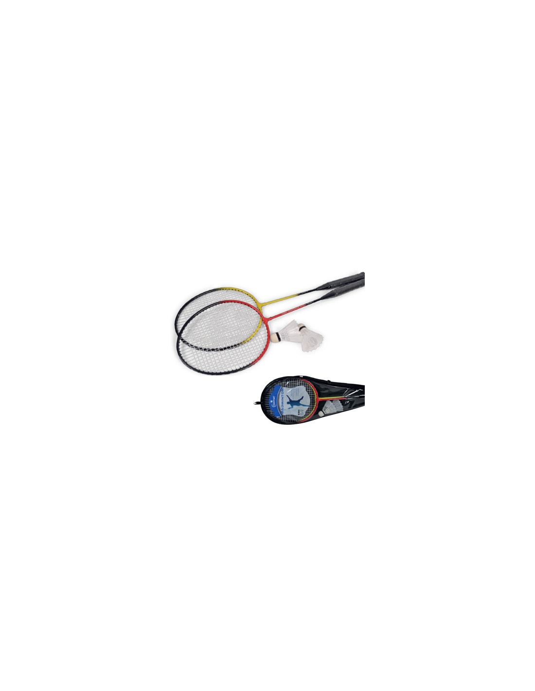 I väskan ligger 2 racketar och 2 badmintonbollar i plast.