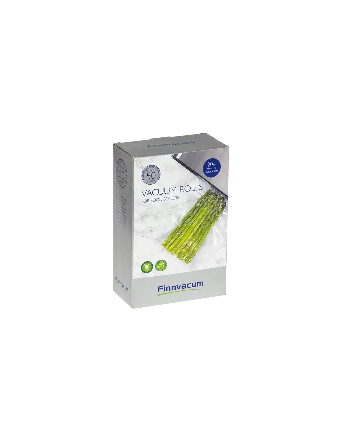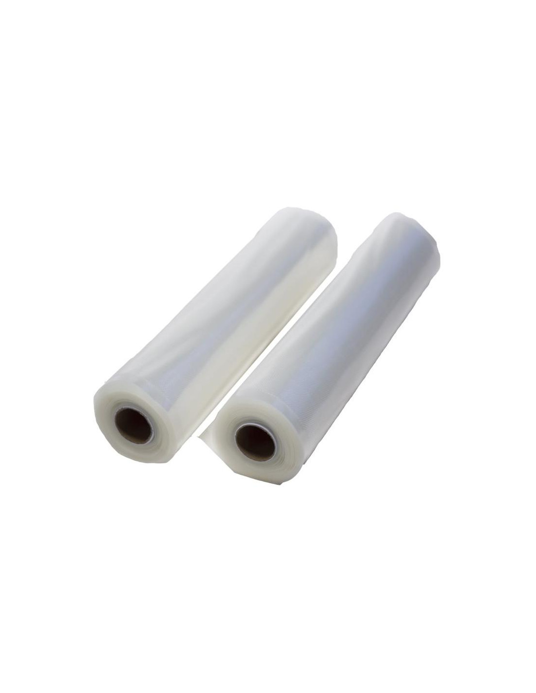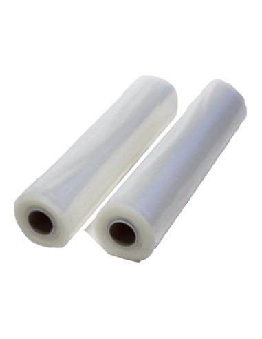 Vakuumrulle x2 rullar tillverkade i 140 my kraftig präglad plast med luftkanaler. Rullen kapas till lagom längd, ena änden svetsas ihop med vakuummaskinen och därefter används den som motsvarande påse. Rullarna kan användas i alla tillräckligt breda vakuummaskiner.