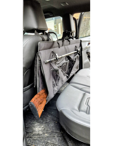 Snygg och praktisk vapenhållare för bilen till 2st vapen! Den fästes enkelt bakom framsätena i bilen, och du kan komma åt vapnen från båda sidor som har dragkedja försedda öppningar. Utöver detta kan du även enkelt fästa skjutkäppen i hållaren. Det finns även 3st stora dragkedje försedd fickor för bla. handkikare, ammunition osv.