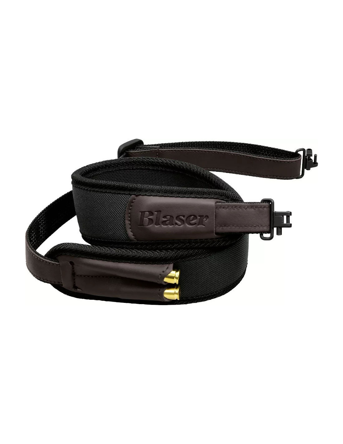 Vapenrem i neopren och läderdetaljer från Blaser. Med en vid och mjuk axelplatta för god komfort. Med integrerad patronhållare för 2 kulpatroner och snabbfäste.