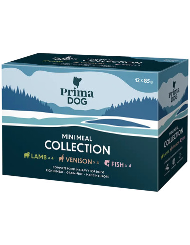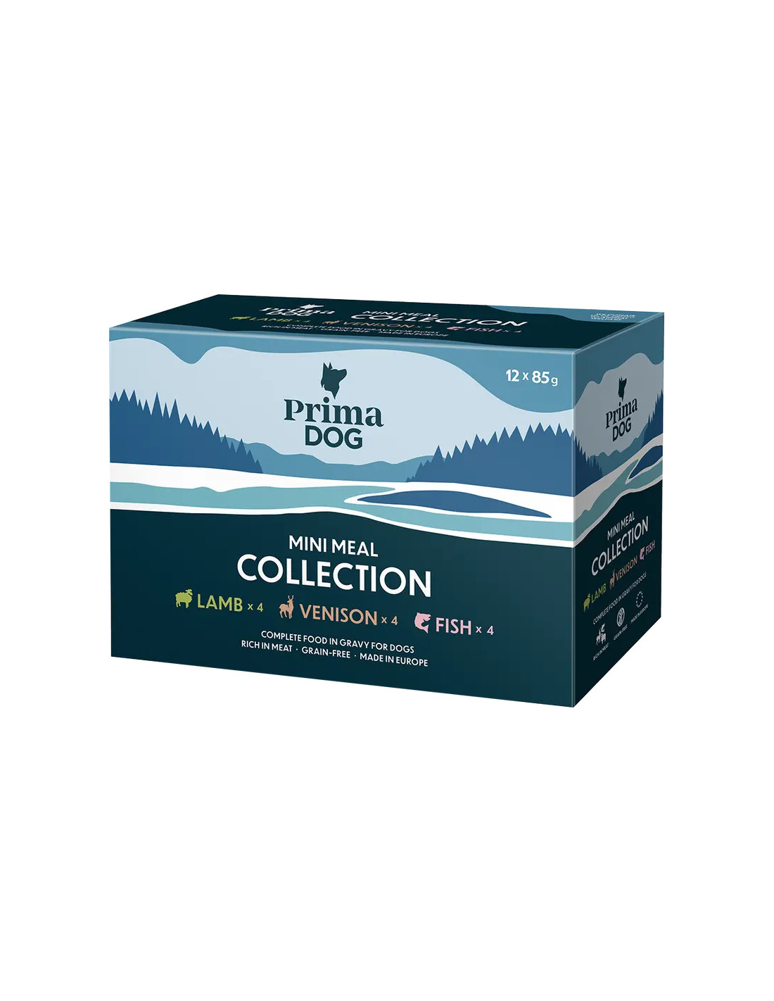 Mini Meal Mix från PrimaDog är en varierad våtfodersbox med fyra påsar av varje smak - lamm, hjortkött och fisk (totalt 12 Mini Meals). Fodret ger din hund möjlighet att njuta av olika smaker samtidigt som det tillgodoser alla näringsbehov.
