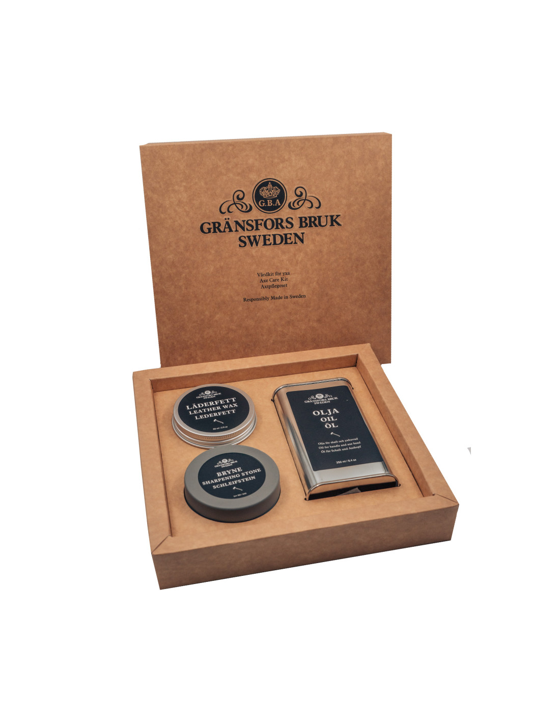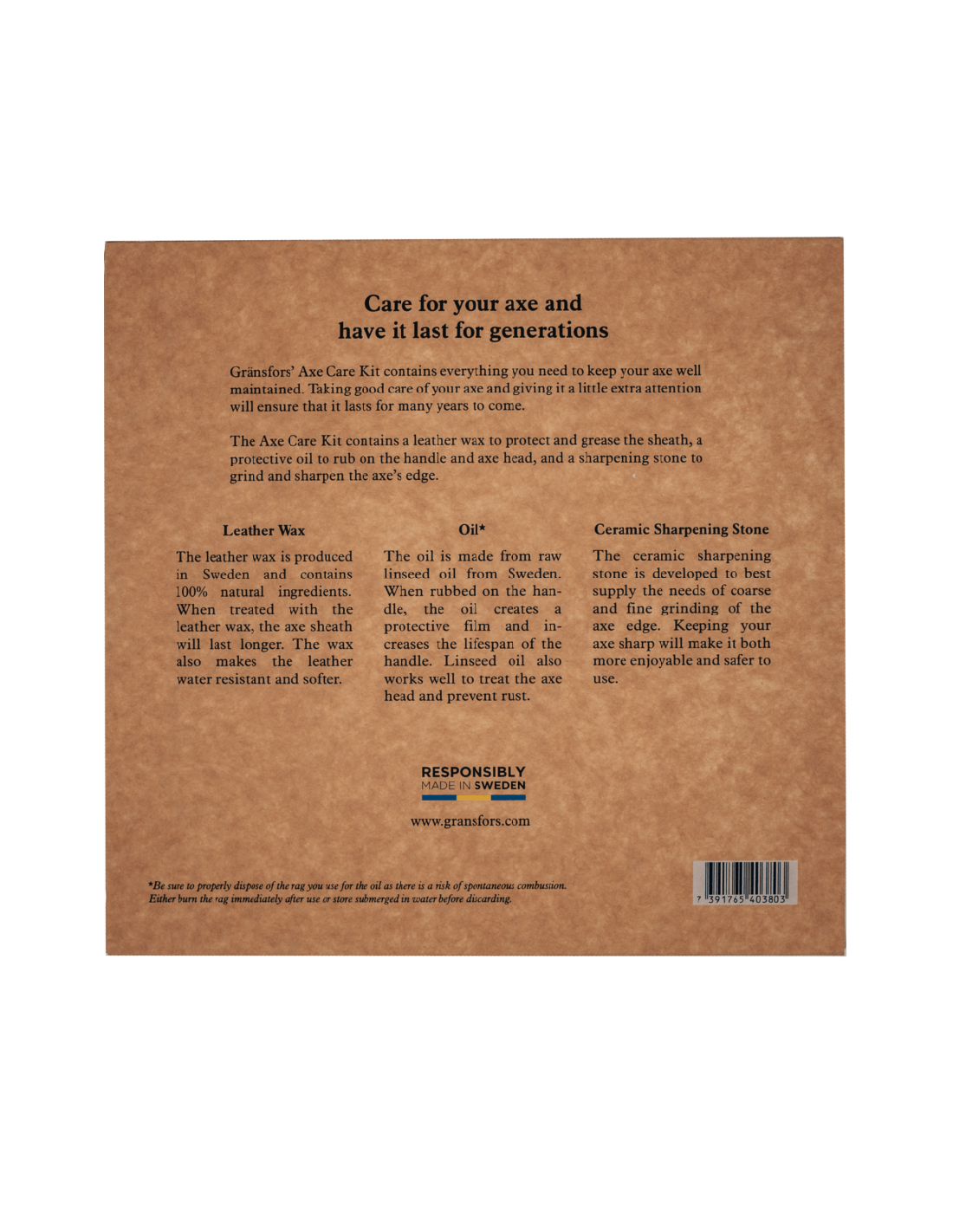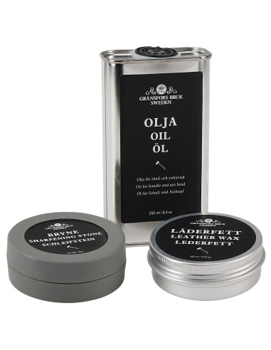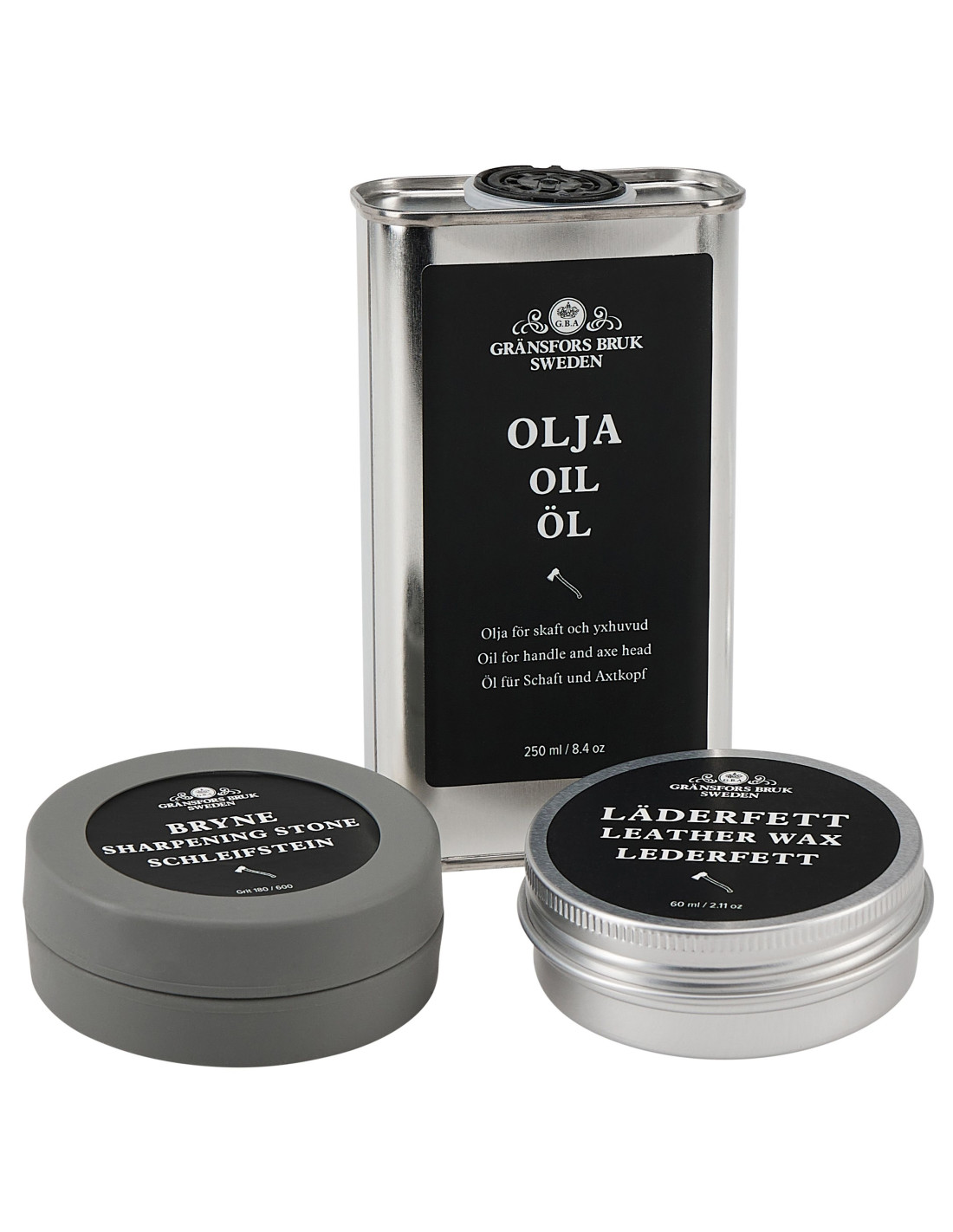 Vårdkitet består av ett läderfett för att skydda och smörja in ditt eggskydd, en vårdande olja för att smörja skaft och yxhuvud, samt ett bryne för att slipa och skärpa yxans egg.